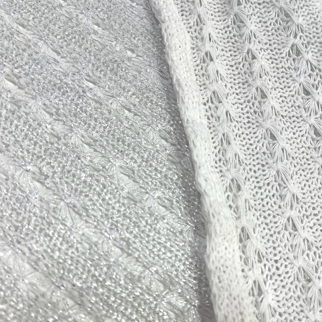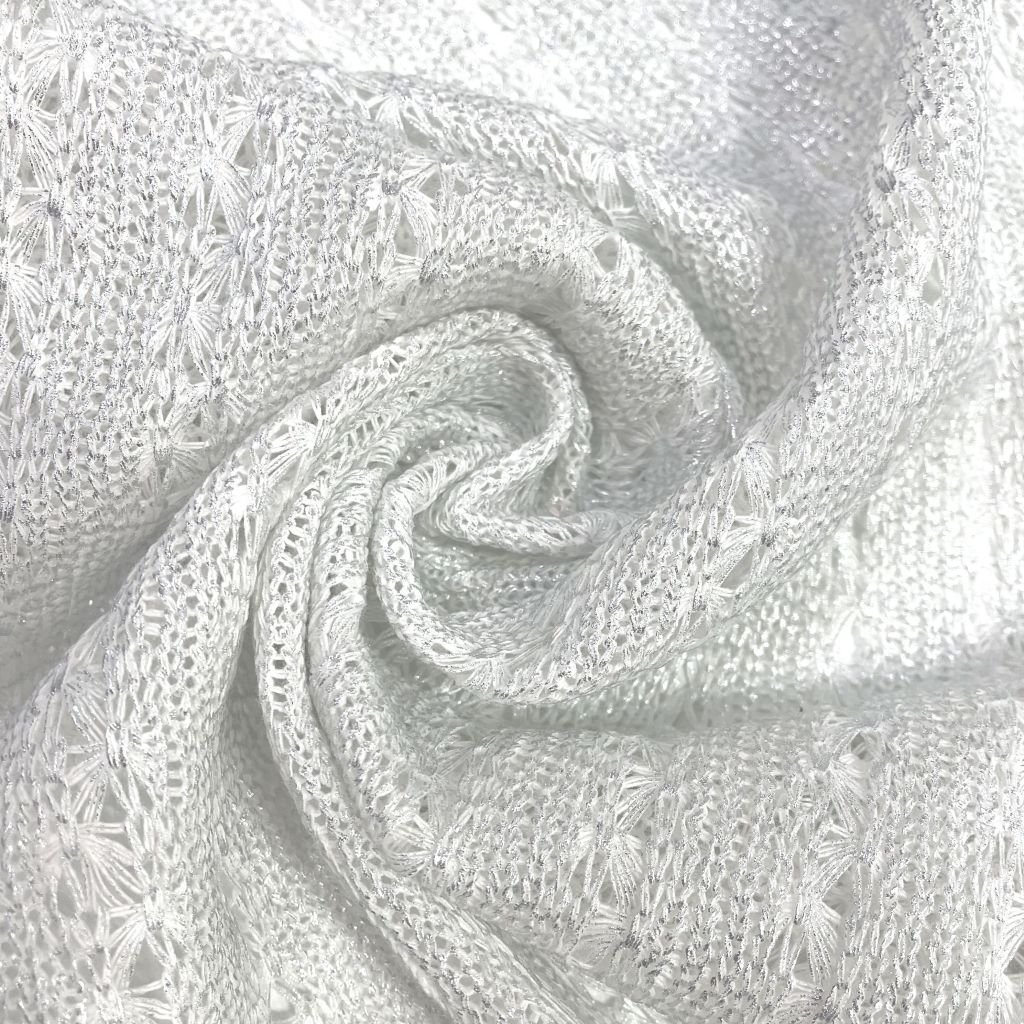 Прекрасный тонкий изящный трикотаж, напоминающий плетеное кружево. Проявите фантазию и дополните свой гардероб коллекцией из элегантных платьев, женских халатов и пижам, многообразия вечерних нарядов, а также оригинальных топов и сарафанов. Подчеркните свою индивидуальность. Требует деликатного обращения - ручная стирка , сушка в горизонтальном положении. Очень деликатная утюжка. Поверх вязки нанесено напыление серебром