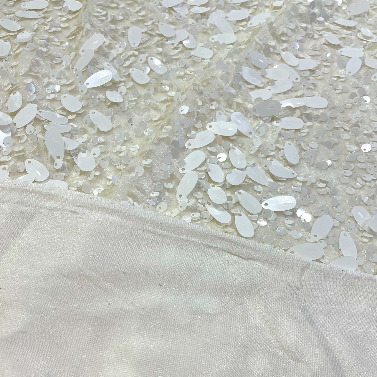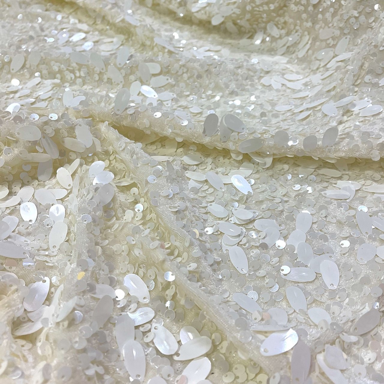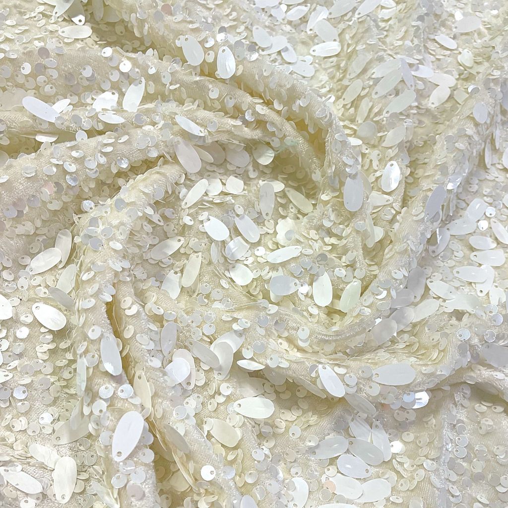 Тонкий стрейчевый бархат расшит пайетками и по всему полотну. Размер каждой пайетки 6 мм и плюс по всему полотну добавлены пайетки в виде капли, которые придают ткани дополнительный блеск при каждом движении. Великолепная ткань для создания цельного вечернего образа, или отдельных фрагментов изделия, которые придадут ему легкий шик и необычность.